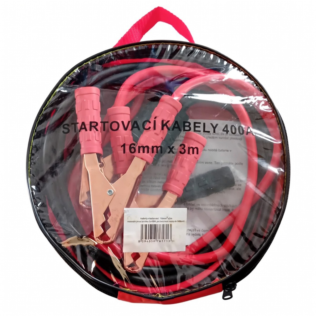 Kvalitní startovací kabely s izolovanými klešťovými svorkami, v plastikové tašce. maximální proud 400 A po dobu 5 s pro benzinové motory do objemu 1400 cm3 pro motocykly, čtyřkolky pro zahradní techniku Délka 3 m. Síla vodičů 16 mm2. Hmotnost 1,2 kg